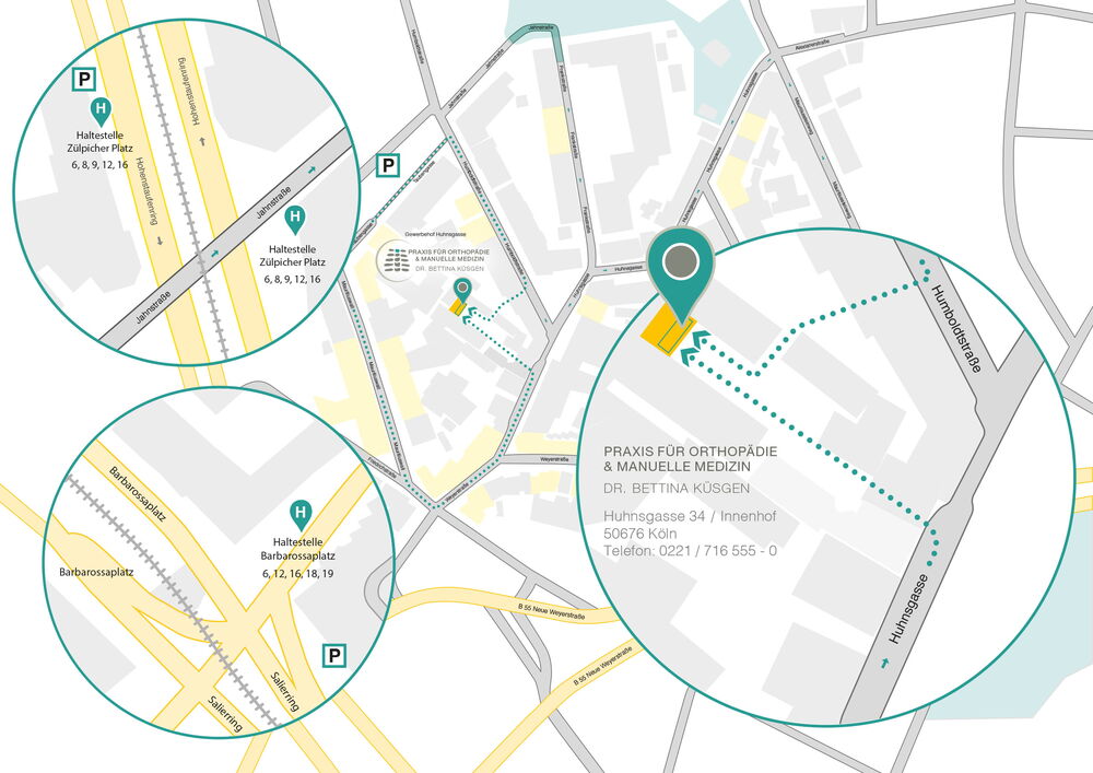 Ab Neumarkt mit der Straßenbahnlinie 9 bis Haltestelle Zülpicher Platz, von dort 7 Minuten zu Fuß bis zur Praxis.